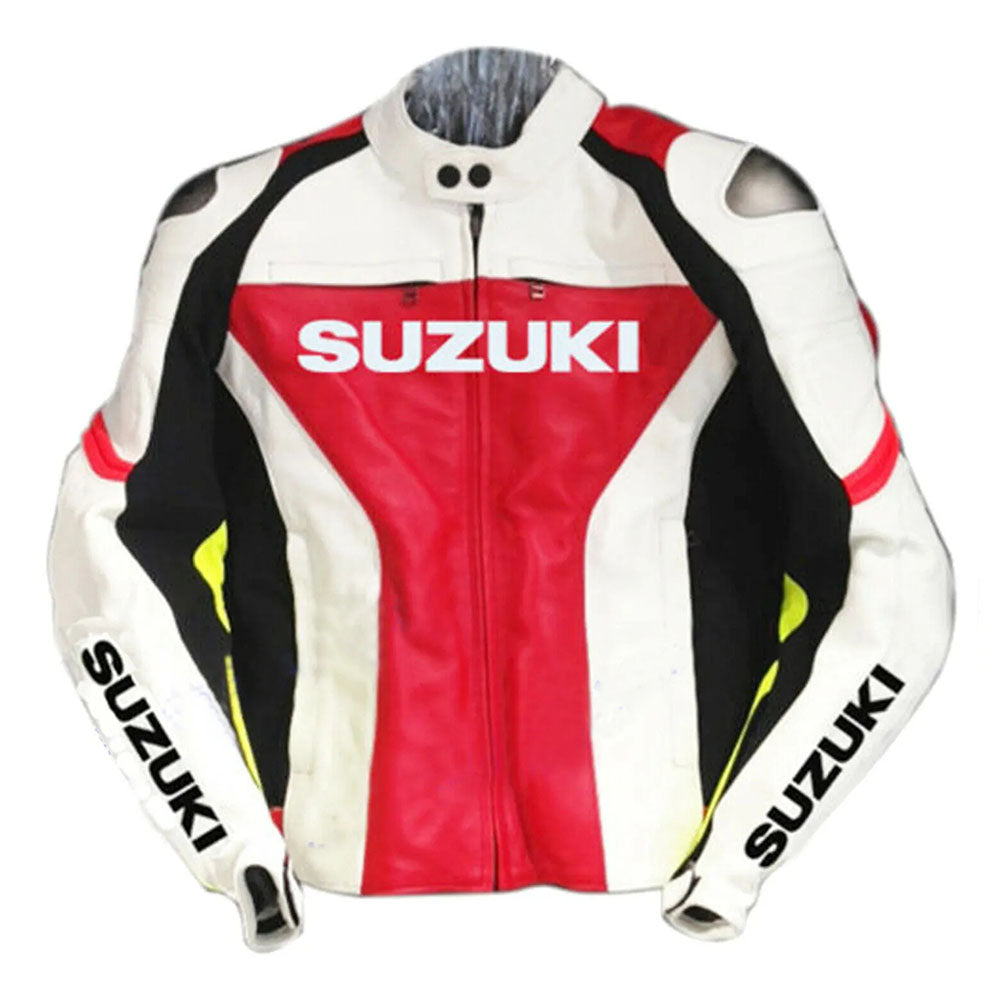 Suzuki GSXR Red And White Safety Pads Motorbike Leather Racing Jacket
